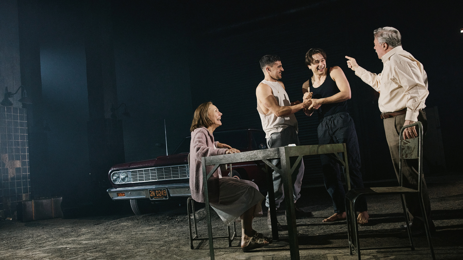 In other words, Willy looks like he just stumbled in from a little play called Death of a Salesman. And that feeling of temporal displacement is present elsewhere in this spare, abstract mounting by Mantello and a distinguished creative team. Chloe Lamford’s vaguely dystopian set, somewhere between a decaying ‘40s garage and a modern crumbling warehouse, feels both contemporary and ancient. Mance’s other costumes have a similarly displaced quality—Linda Loman’s bathrobe wouldn’t look out of place in a suburban household of today.