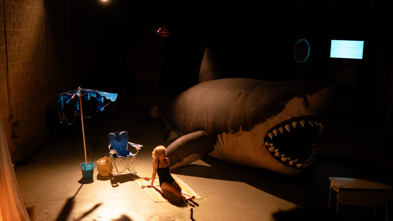 Sure! Why not? Ellen here delivers most of the lines intended for husband Richard Brody (Roy Schneider on screen) to a huge inflatable shark that sits at the center of Claudel and Mitchell Polonsky’s delightfully off-kilter staging at Target Margin’s Doxsee space in Sunset Park.
