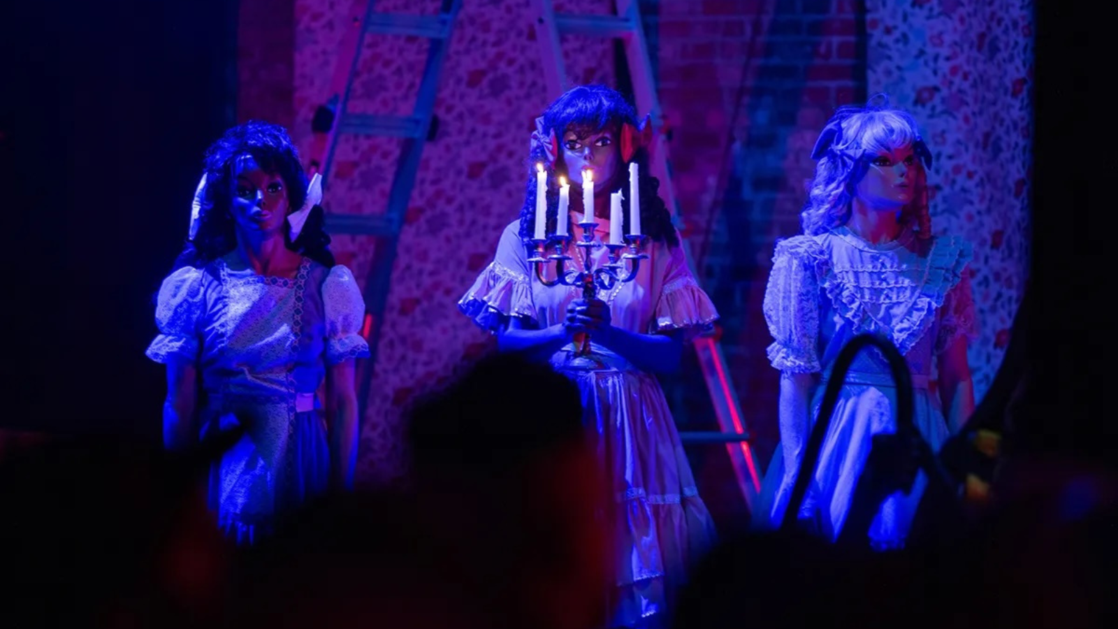 An elaborate Rube Goldberg machine fills every nook and cranny of NYU Skirball’s expansive stage. Three doll-like figures in creepy masks, pigtails and square-dancing dresses, emerge from a treehouse. They inspect the massive set-up with childlike wonder. Then. as a live musical score creeps in (played live by Holland Andrews), the three begin to wreak havoc.