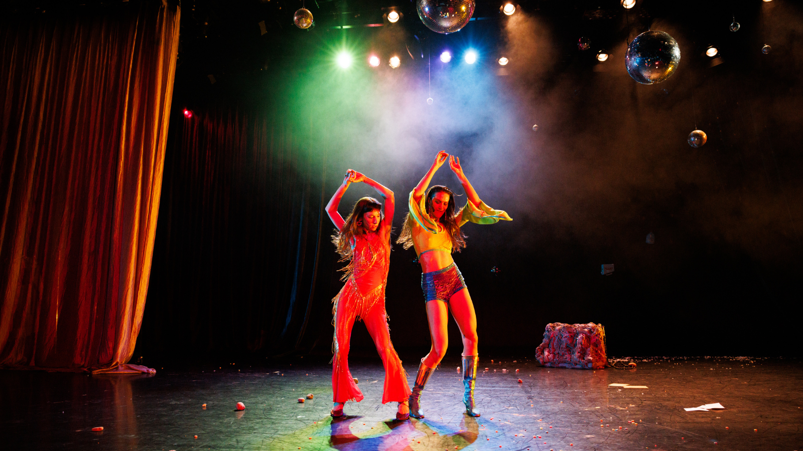 A demented circus of capitalistic chaos. I can’t claim to fully understand or explain Friday Night Rat Catchers, a dance spectacle co-created by Lisa Fagan and Lena Engelstein alongside devising partner Marianne Rendón. All three perform the work together, stumbling between manic extremities of stifling contemporary life. “Hosted” by a grinning talk-show presenter type near the end of his rope (Rendón), Rat Catchers is an absurdly entertaining cavalcade of desperate clownery.