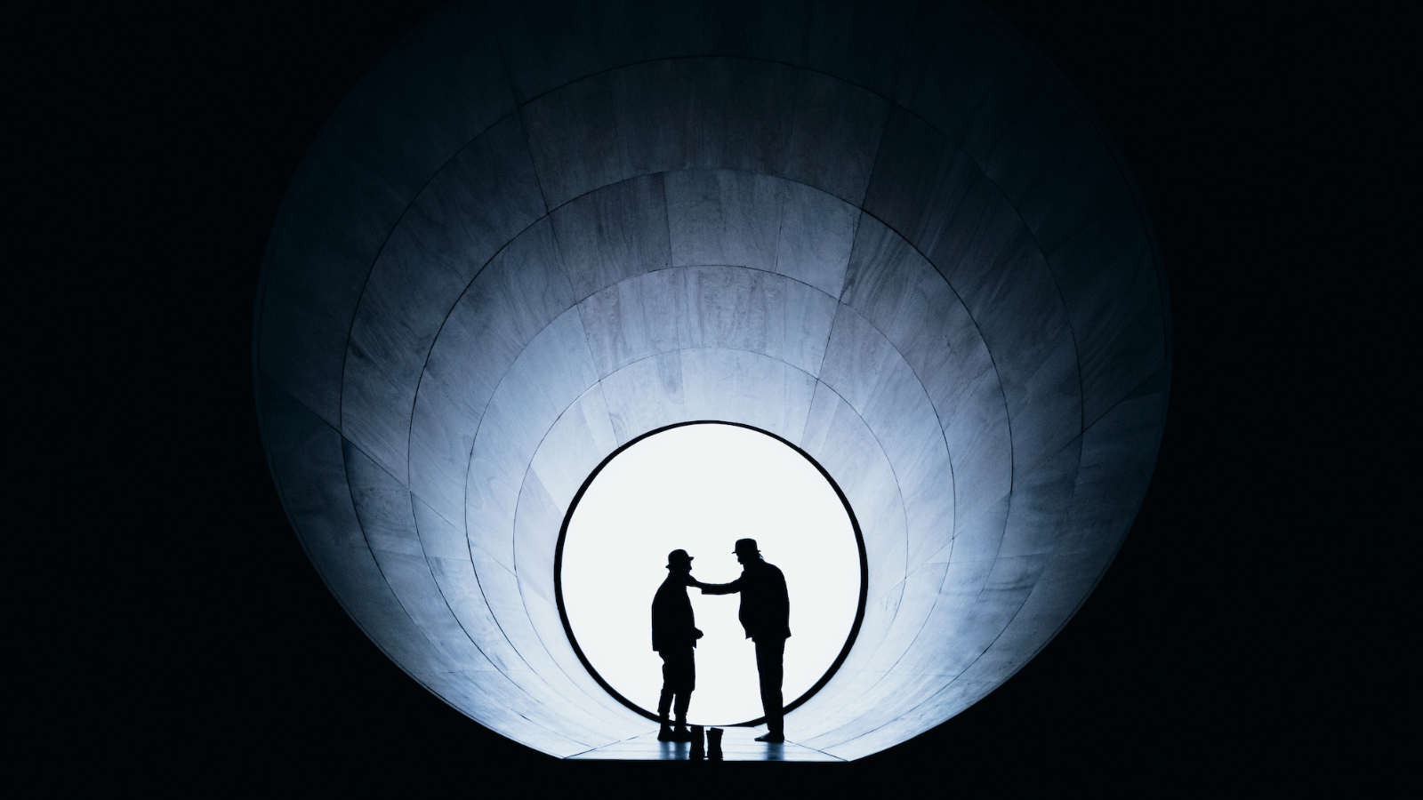 Lloyd’s vision takes place within a massive vortex (designed by Soutra Gilmour) that suggests an internet-age existence both futuristic and, by dint of its looking like a submarine cable, perilously tactile. It’s not the country road Beckett calls for, but the information superhighway. As in the best opera sets, it’s simple, gorgeous, effective and relentlessly watchable. Its brutalism creates some fantastic tableaux and allows for great moments of physical comedy, as the men run up its walls and slide back down, Sisyphus style, or stand on its curve with their feet comically slanted. At one point, while Thornton shines in his speech, Dirden peeks from outside of it, clinging to its edges like a Grand Guignol villain, bowler hat and all, with mustache-twirling delight. (Gilmour also did the costumes, which include a rather kinky muzzle for Lucky; all leather and straps.)