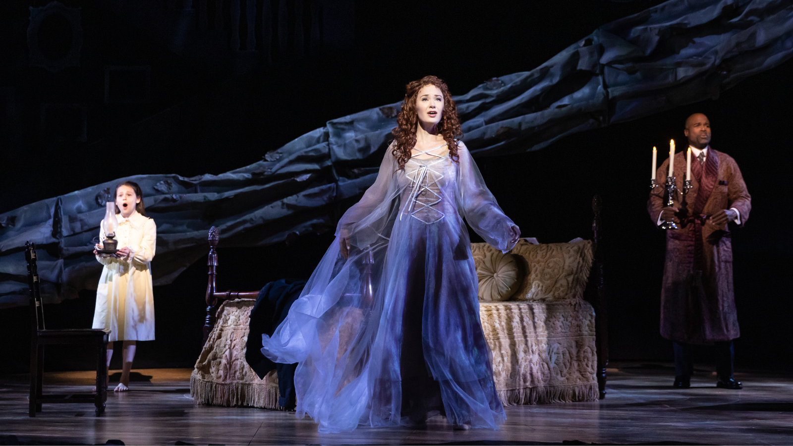 Plucky Mary Lennox (Emily Jewel Hoder) is orphaned after her parents Albert and Rose (a deliciously callous Ali Ewoldt) die of cholera in turn-of-the-century India. She’s shipped off to a gloomy old house on a gloomier moor to live with her reclusive uncle Archibald Craven (Derrick Davis), who’s still grieving the loss of his beloved wife Lily (the ethereal Sierra Boggess). A locked, dead garden, a deathly ill cousin, and a glut of ghosts (draped in Ann Hould-Ward’s gauzy gowns) round things out. (As my date and I remarked at intermission, for a beloved children’s novel, The Secret Garden is really freaking depressing!)
