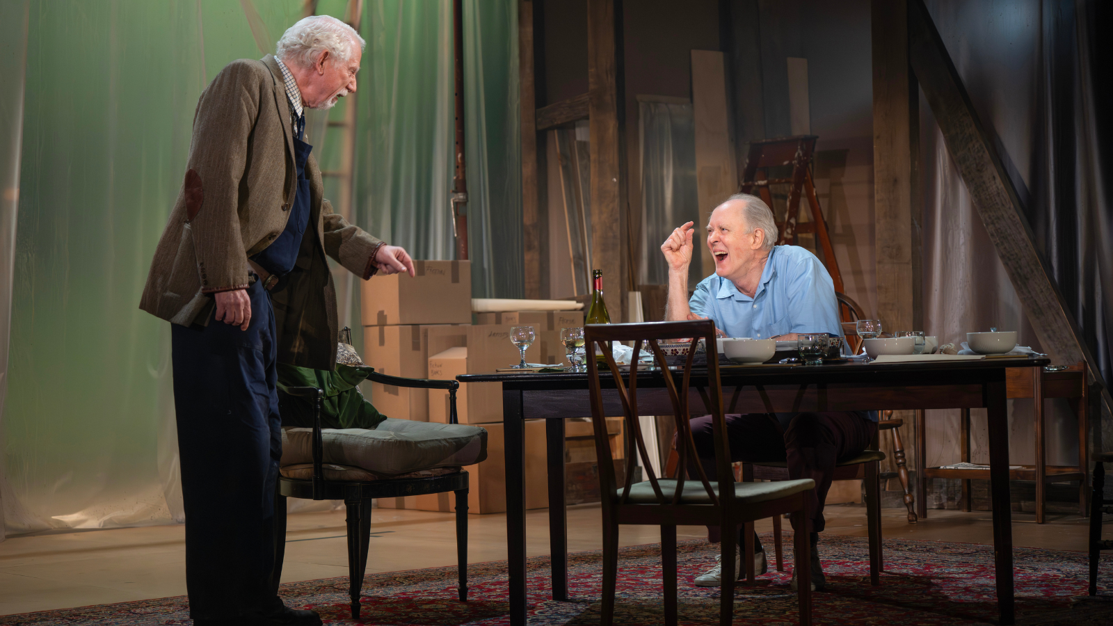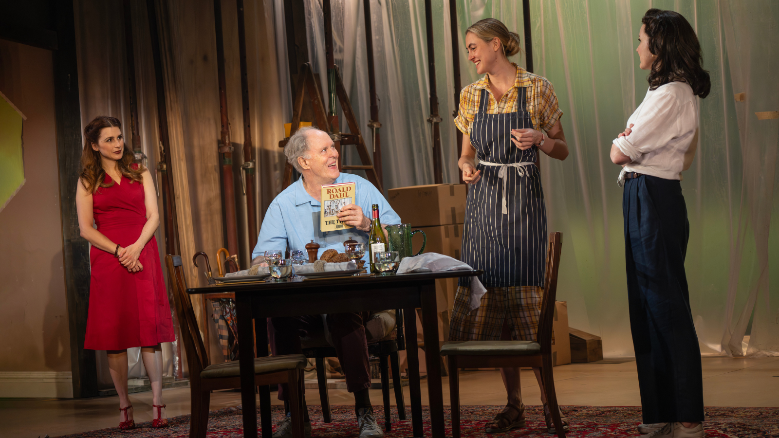Lithgow plays Roald Dahl in 1983, when the pending release of his book The Witches is shrouded by the controversy he’d stirred through an article in which he condemned Israel’s recent invasion of Lebanon and shamed Jews for not denouncing the act. Whether that last item was a crass overstep or a sign of latent antisemitism is the subject of the play, as a Jewish woman from his American publishing house is sent to his home in England to persuade him to apologize. He refuses, unwilling to bow to public opinion, and the clever nastiness which made his stories so indelible reveals itself to be one of his key character traits, as he needles her with increasingly insensitive remarks whose intentions are fiendishly evasive: does he mean what he says, is he simply enamored by the process of devising new jabs, or is it all just for attention?